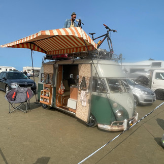 Wir haben unseren Campervan namens "Oscar" mit unseren E-Bikes beladen und uns Freitags Mittags auf den Weg nach Dänemark gemacht. Die Insel Römö ist mit einem schmalen Damm mit dem Festland verbunden und somit mit dem Auto ohne große umstände zu erreichen. Bei der Anreise kamen uns auf dem Damm dann reihenweise alte Amerikanische Autos entgegen. Somit war uns klar, dass uns die Navigation in die richtige Richtung gelenkt hatte.